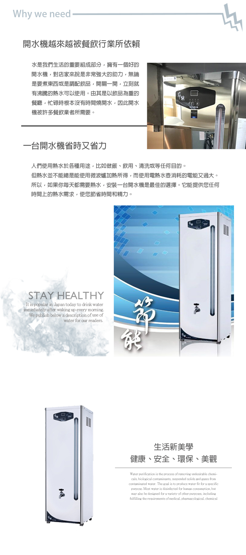 | 材質 | 外殼採SUS304不銹鋼 厚度0.8mm ; 熱缸採SUS304不銹鋼厚1.2mm ; 面板SUS304不銹鋼材質 ; 機體骨架採不生銹材質(含不鏽鋼腳) |