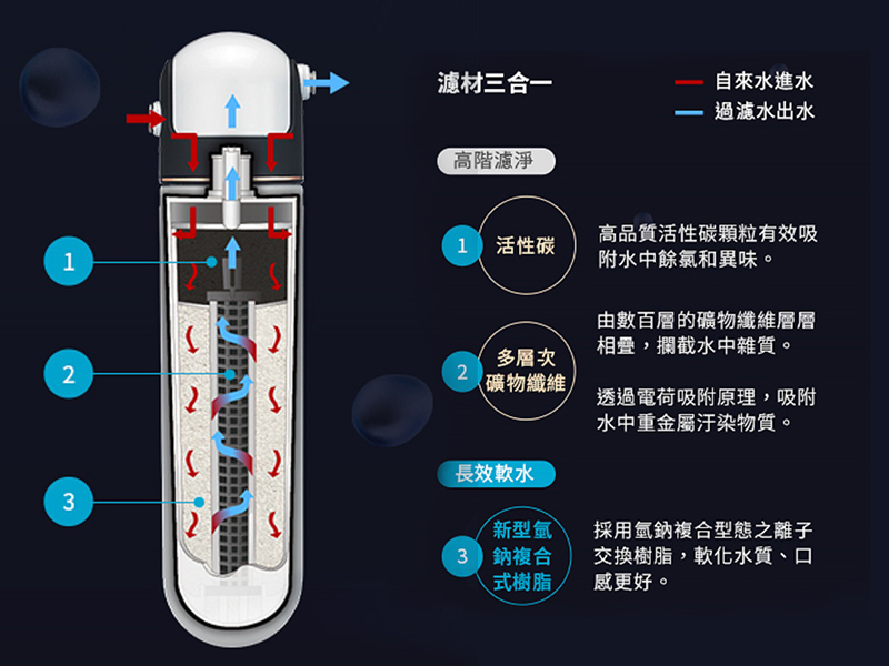 - 使用優質活性碳搭配氫鈉複合型樹脂進行過濾與淨化,再透過多層次礦物纖維吸附水中重金屬與有害物,提供最安心潔淨的居家淨水。